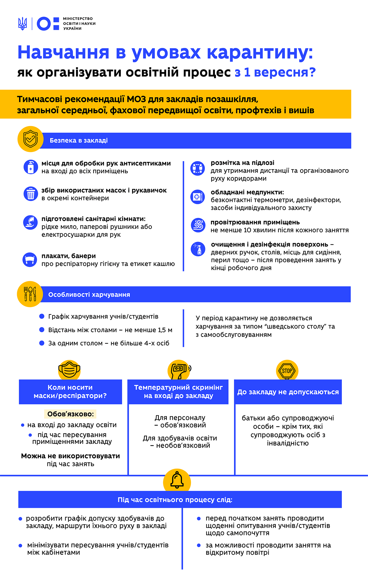 З метою запобігання поширенню коронавірусної хвороби (СОVID – 19) у навчальному 2020-2021 році суб`єкти, що відповідальні за облаштування, утримання закладів позашкільної, загальної середньої, професійної (професійно-технічної), фахової передвищої, вищої освіти (далі — заклади освіти), мають здійснювати свою діяльність з урахуванням цих тимчасових рекомендацій, спрямованих на запобігання ускладнення епідемічної ситуації внаслідок поширення коронавірусної хвороби (СОVID – 19).